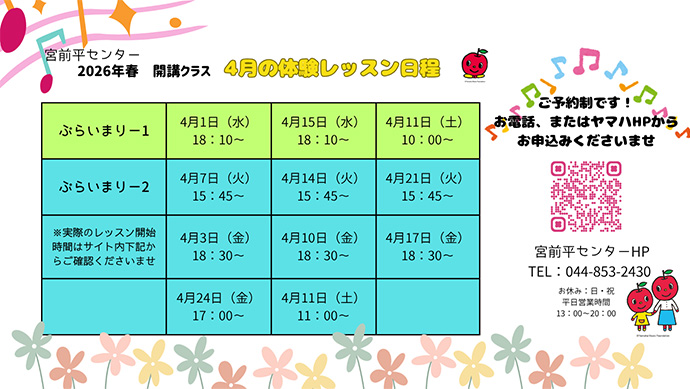 • ※ぷらいまりー1は「グループのみ」を推奨としますが、個人レッスンの回数はご希望に応じてお選びいただけます。入会後、途中で回数を変更することも可能です。